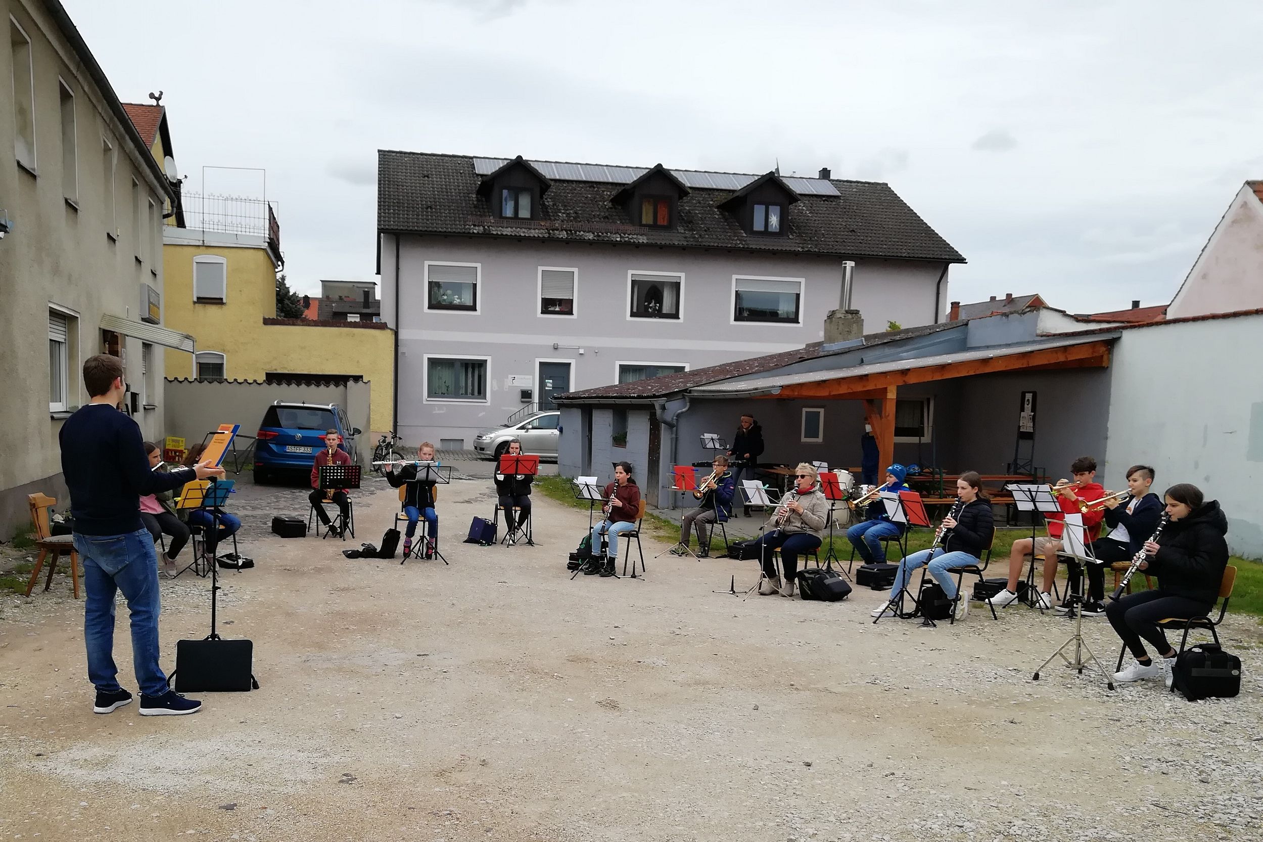 Nach langer Pause konnte am 21. Mai endlich wieder der Probenbetrieb bei den Hahnbacher Marktbläsern aufgenommen werden. Los ging es mit dem NachwuX, der dem Wetter getrotzt und im Freien geprobt hatte. 16 Musiker*innen waren bei der Probe anwesend, wovon jeder einen Covid-Test vorlegen konnte. Da man in geschlossenen Räumen nur mit maximal zehn Personen proben darf, wurde der Hof des Gasthauses zum Paulers dankenswerter Weise wieder zur Verfügung gestellt.