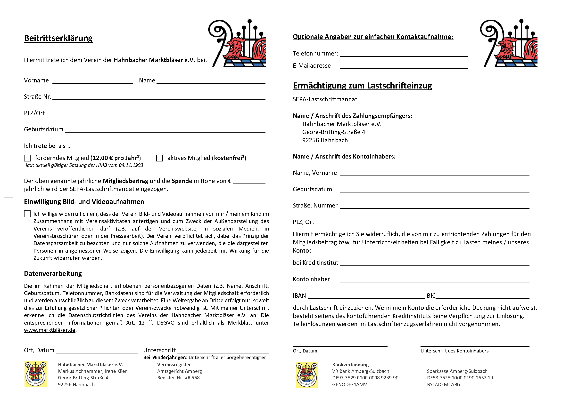 Für aktive Musiker ist die Mitgliedschaft im Verein kostenlos, passive Mitglieder unterstützen uns mit 12 € pro Jahr, oder auch mehr, wenn dies gewünscht ist. Um bei den Hahnbacher Marktbläsern beizutreten musst du einfach nur das Formular unten herunterladen, ausdrucken, ausfüllen und unserem Dirigenten oder Vorstand geben. Natürlich kannst du dir das Formular dort auch persönlich abholen, falls du keinen Drucker hast. Die Adresse findest du im Impressum.